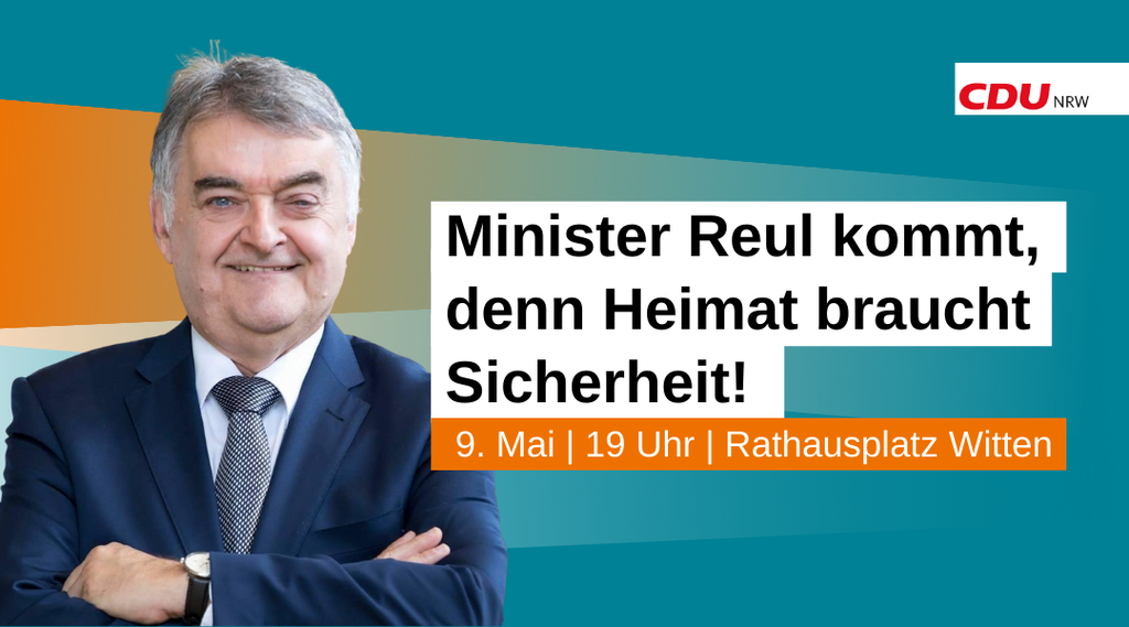 Weil uns die Sicherheit am Herzen liegt, wollen wir mit unserem Innenminister Herbert Reul über die Innere Sicherheit in unserer Region diskutieren. Kommen Sie gern mit Freunden und Familie am 9. Mai ab 19 Uhr auf den Rathausplatz in Witten.